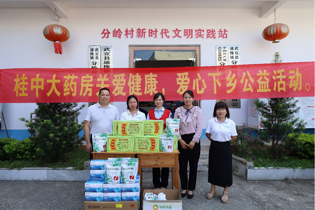 活動(dòng)最后,桂中大藥房在分嶺村開展了健康檢測(cè),免費(fèi)為村民提供測(cè)量血壓、血糖,發(fā)放口罩、板藍(lán)根等惠民醫(yī)藥用品和健康知識(shí)手冊(cè),把“健康”送到村。