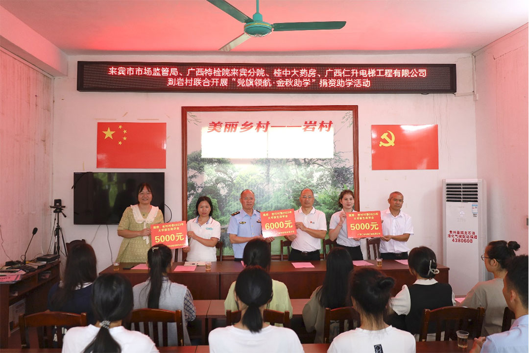 為照亮學(xué)子們的求學(xué)路,用實(shí)際行動(dòng)傳遞愛心和正能量,9月6日-7日,來賓市市場(chǎng)監(jiān)管局聯(lián)合桂中大藥房分別來到武宣縣通挽鎮(zhèn)分嶺村和象州縣巖村,聯(lián)合開展“黨旗領(lǐng)航·金秋助學(xué)”捐資助學(xué)及惠民活動(dòng)。分別有來賓市市場(chǎng)監(jiān)管局黨組成員、副局長黃彥妮,來賓市市場(chǎng)監(jiān)管局黨組成員、副局長陳仁鵬,通挽鎮(zhèn)鎮(zhèn)長覃家浮,桂中大藥房質(zhì)管總監(jiān)陳麗,市局相關(guān)科室負(fù)責(zé)人、來賓市市場(chǎng)監(jiān)管局領(lǐng)導(dǎo)、廣西特檢院來賓分院有關(guān)領(lǐng)導(dǎo)、來賓市市場(chǎng)監(jiān)管局第二黨支部黨員、象州縣運(yùn)江鎮(zhèn)巖村村黨總支部黨員、巖村村“三委”干部、巖村駐村工作隊(duì)員、巖村村大學(xué)新生及家長代表等參與了這兩場(chǎng)活動(dòng)。