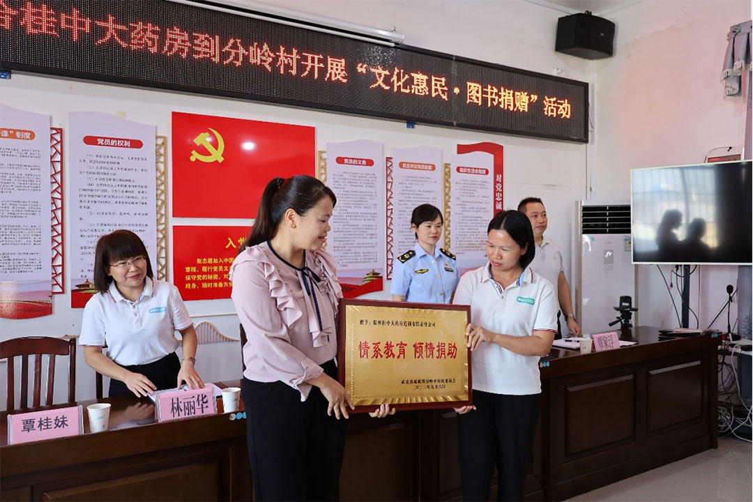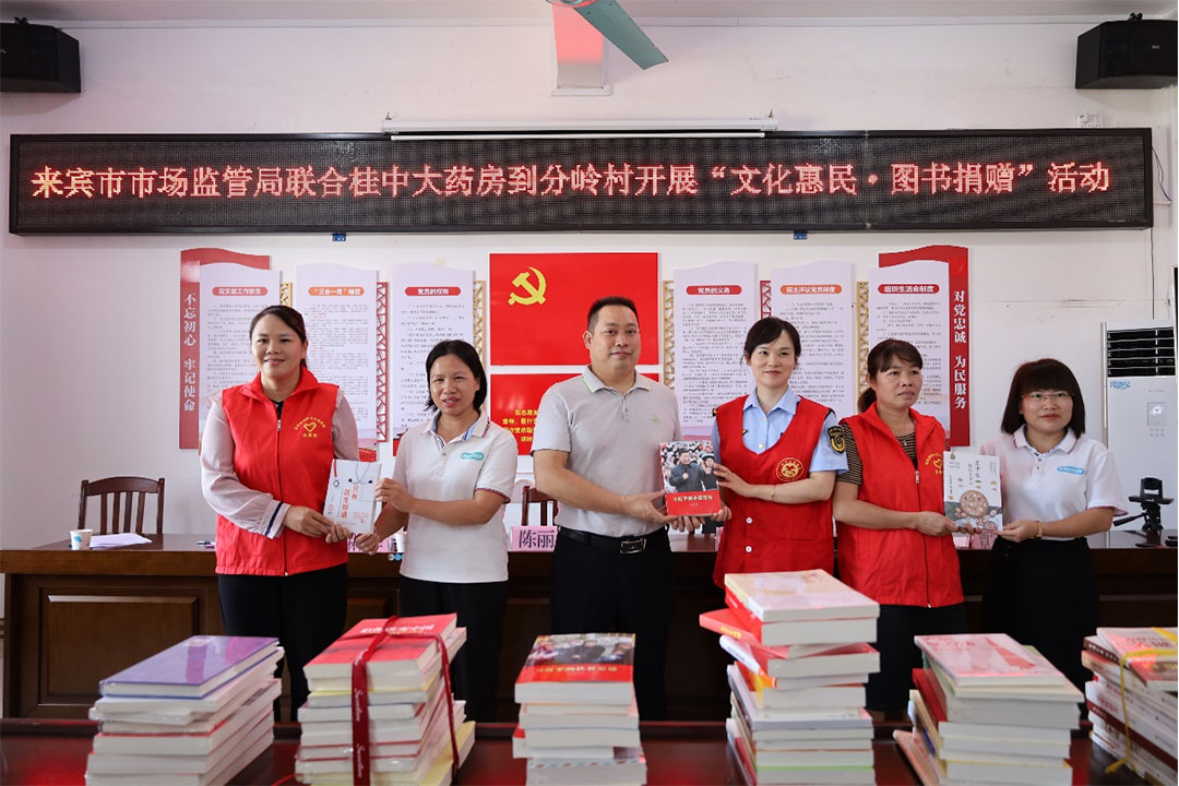 在“文化惠民·圖書捐贈(zèng)”活動(dòng)中,市市場(chǎng)監(jiān)管局聯(lián)合桂中大藥房向分嶺村委捐贈(zèng)圖書約100本,內(nèi)容涵蓋政治、文學(xué)、歷史、醫(yī)藥衛(wèi)生、教育等方面,為促進(jìn)鄉(xiāng)村文化振興提供了精神糧食,豐富了廣大村民群眾的精神文化生活。